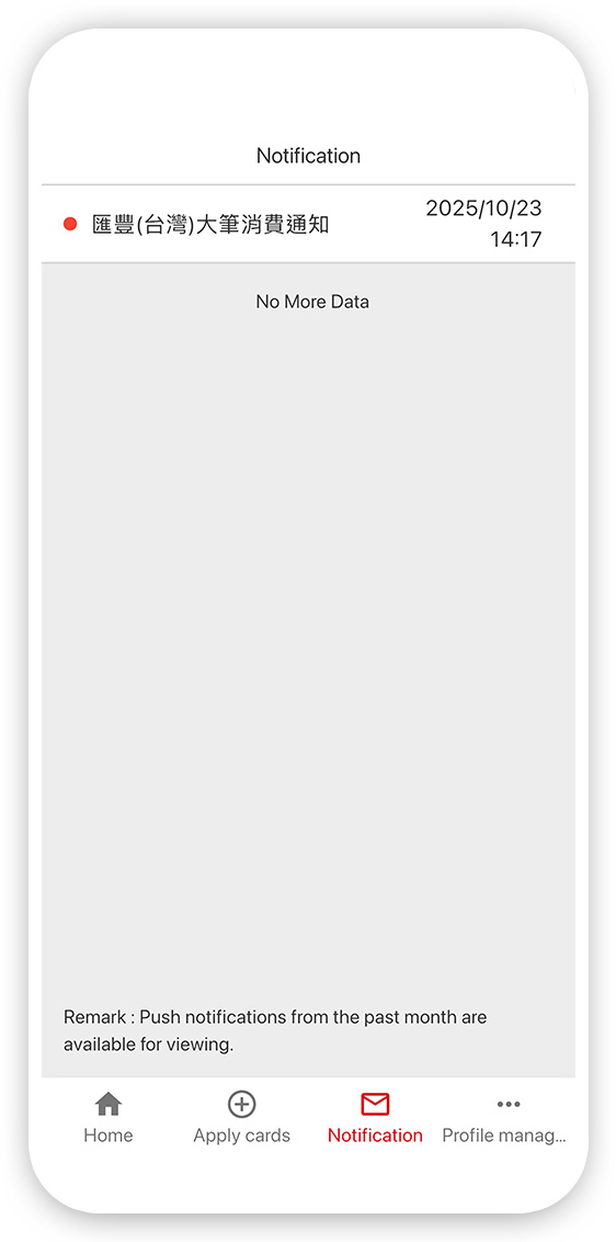 After you logged in to the Credit Card App, you can click the card field to proceed with functions and features like card overview, account information, transaction records, card lost reporting and reissuance, instalment payments, temporary credit limits, cash rebate preference, reward points management and cash advance PIN set-up, you can keep track of your credit card usages no matter when and where. You can also click into Profile management for other settings.