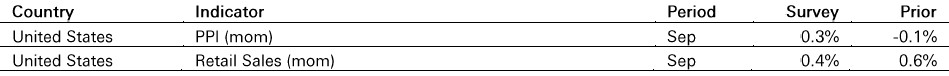 In the US, the ongoing government shutdown is likely to delay the release of September PPI and retail sales figures, originally scheduled for today. A one-off drop in trade services in August should reverse, lifting core PPI to a 0.3% mom gain in September, from -0.1% mom in August. Core goods prices may firm on higher tariffs. Meanwhile, retail sales growth is expected to ease to 0.4% mom in September, from 0.6% mom in August.