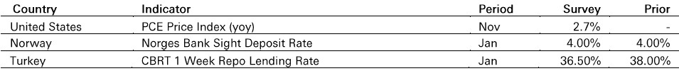 In the UK, headline inflation unexpectedly rose to 3.4% yoy in December, from 3.2% yoy in November, pushed higher by air fares and tobacco prices.