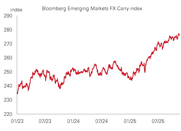 Emerging market (EM) carry-trade strategies – which borrow in low-yielding currencies to invest in higher-yielding ones – have had an impressive run this year. Bloomberg’s EM FX Carry index, comprising eight EM high-yielding currencies, is up 13% year-to-date versus the US dollar. Part of this, of course, has been driven by broad weakness in the dollar during the first half of 2025. However, it is notable that since July, while major G10 currencies like the euro have stalled, and others like sterling and the yen have fallen against the dollar, EM majors have powered ahead with further gains.