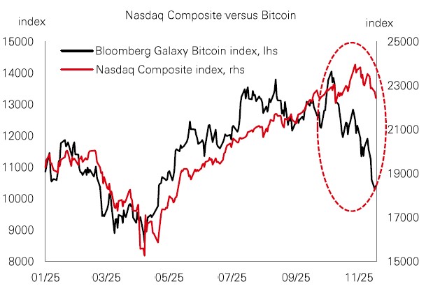It marks another twist in a rollercoaster year for the crypto coin, which has benefitted from strong retail inflows via ETFs, and the tailwind of Fed policy easing. US legislative support with the GENIUS Act and vocal backing from the US administration have also boosted sentiment. But its high sensitivity to macro and market sentiment have seen sharp sell-offs, particularly after April’s ‘Liberation Day’ US tariff announcements. The latest collapse coincided with heightened US-China trade tensions, and uncertainty over whether the US Fed will cut rates again in December.