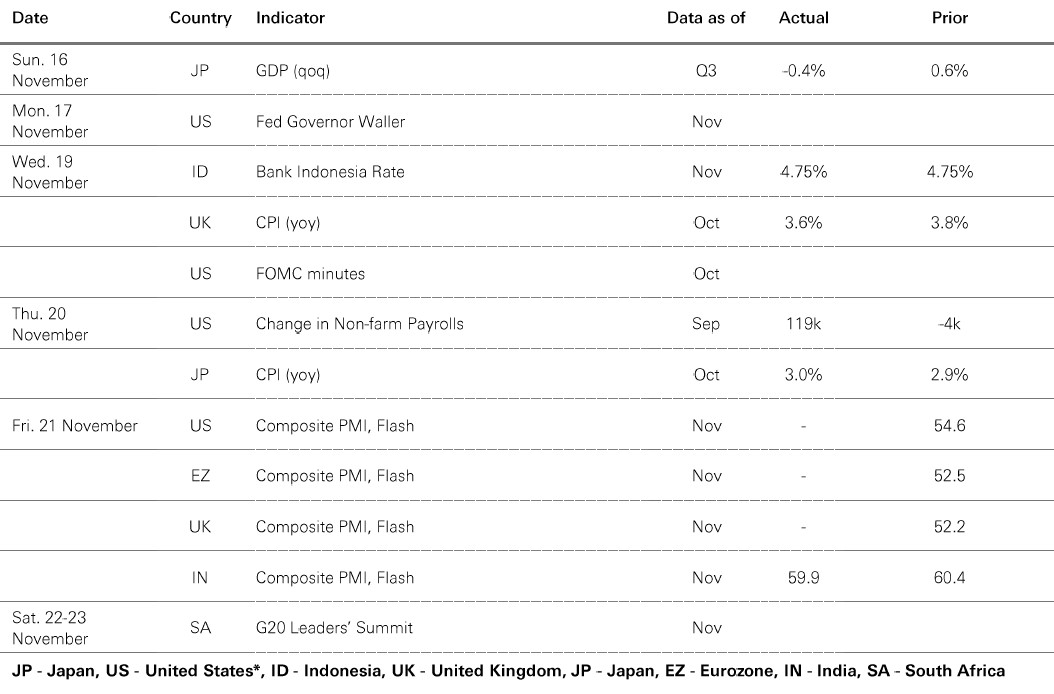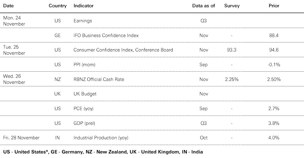 Source: HSBC Asset Management. Data as at 7.30am UK time 24 November 2025. For informational purposes only and should not be construed as a recommendation to invest in the specific country, product, strategy, sector or security. Any views expressed were held at the time of preparation and are subject to change without notice. Any forecast, projection or target where provided is indicative only and is not guaranteed in any way. *The US government shutdown has ended, but there may still be delays to the expected releases of official data.