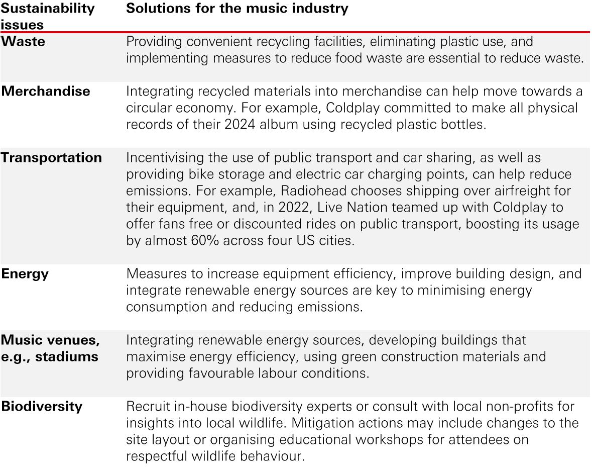 Industry stakeholders and researchers have suggested several steps to improve the sustainability of the music industry, which we summarise in Figure 2.