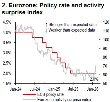 Meanwhile, the European Central Bank (ECB) kept rates unchanged as expected in February, but struck a slightly hawkish tone, highlighting resilient growth (Chart 2). ECB President Christine Lagarde downplayed the recent inflation dip and signalled rates will remain on hold for some time. She also dismissed concerns about EUR strength, noting FX moves are already factored into forecasts and the EUR remains within its average range.