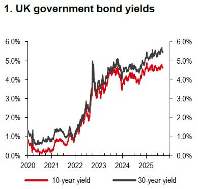 Slowing QT and reducing the proportion of long maturity gilt sales should generally help stabilise financial market conditions and the GBP, but the impact may prove marginal. We think that the Autumn Budget (26 November) is likely to remain the key driver for the GBP in 4Q25, with the fragility of the UK government finances being a key risk for the GBP. Higher long-term gilt yields (Chart 1) would likely weigh on the GBP if it comes to growing market concern on the UK government’s capacity to meet its fiscal target. Higher taxes or lower government spending may also add to GBP woes for an already stalled economy. But the GBP weakness is likely to reflect against the EUR.