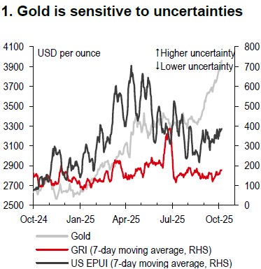 On 8 October, gold smashed above USD4,000 an ounce for the first time, bolstered by uncertainties (Chart 1), like the ongoing US government shutdown, renewed tariff concerns, and growing political uncertainty in France. Markets are also becoming more concerned over fiscal challenges not just in the US but also in other economies, such as France, the UK, and Japan, all of which likely contributed to the price of gold moving higher. Perhaps, the “fear of missing out” (FOMO) can explain a good portion of the recent gold rally, in our precious metal analyst’s view.