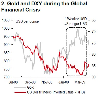 It is worth noting that gold has been rallying alongside a stronger (not weaker) USD, with the US Dollar Index (DXY) rising to a two-month high (Bloomberg, 9 October). The two generally move inversely. The fact that gold can rally in the face of a stronger USD could be a sign of risk aversion, driving demand for “safe haven” assets, whether for hedging or diversification. This is unusual, but it did happen during the Global Financial Crisis (Chart 2), for example.