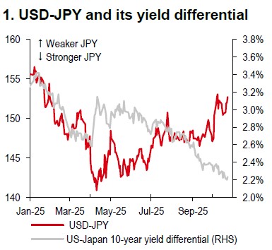 We believe the downward pressure on the JPY, arising from market concerns about fiscal loosening and the Bank of Japan’s (BoJ) dovish stance, may not be longlasting. The heightened political sensitivity to cost-of-living issues in Japan suggests that the new Finance Minister, Satsuki Katayama, is likely to adopt a cautious approach to fiscal expansion. Some degree of fiscal loosening could support the JPY by fostering a more optimistic growth outlook.