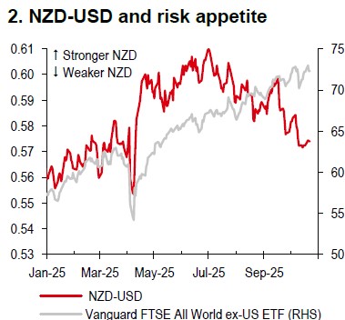 As for the NZD, it has been facing significant domestic challenges. After the 50bp easing by the Reserve Bank of New Zealand (RBNZ) on 8 October, markets are fully priced for a further 25bp cut on 26 November (Bloomberg, 23 October). Our economists also expect this, given the combination of weak economic activity, easing underlying inflation, and a still-weak jobs market, which leaves little to prevent further RBNZ easing. But with a lot of domestic issues already in the price, alongside rising risk appetite (Chart 2), and if our expectation of broader USD weakness holds true, the NZD appears poised for consolidation in the coming weeks.