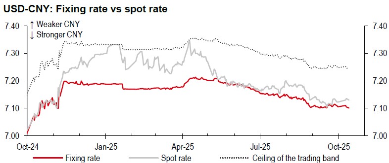 The USD-CNY fixing rate was at 7.1007 today (13 October), the lowest level since US elections last November. This indicates a steady FX policy, despite the tariffs threat. Ahead of the fourth plenum (20-23 October), the Chinese authorities are probably prioritising domestic market stability. That being said, the low-probability but high-impact risk is that we could see another round of tit-for-tat tariffs (not merely threats), like what happened in early April. Back then, the USD-CNY fixing rate increased from 7.17 to nearly 7.21, with the spot rate moving near the ceiling of the USD-CNY trading band. But on a positive note, US President Trump softened his tone this morning, with Vice President JD Vance casting it all as an ongoing negotiation (Bloomberg, 13 October 2025).