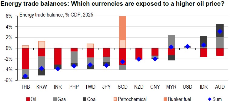 Ultimately, oil price movements will play a critical role in determining currency direction. The Strait of Hormuz, which handles approximately 19% of global oil shipments, represents a key point of sensitivity. Any disruption could have a substantial impact on FX markets, especially for major net oil importers (see the chart below). Conversely, a de-escalation of geopolitical tensions would likely see the USD relinquish recent gains, as the underlying factors supporting a softer USD outlook remain unchanged.