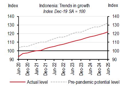 Indonesia’s post-pandemic GDP growth has been weak. Despite higher-than-expected 2Q25 GDP growth of 5.1%, we estimate that GDP is still c7.5% below its pre-pandemic trend. The highfrequency indicators like manufacturing PMI, credit, and consumer sentiment also point to softness.