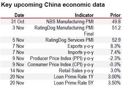 At the time of writing, China’s policymakers are convening for the Forth Plenum (20-23 October) where they will review the 15th Five-Year Plan, setting priorities from 2026 to 2030. We expect a strong emphasis on consumption-driven growth, supported by services consumption and structural reforms to expand social safety net coverage. Other key areas of focus may include fostering innovation, green development and opening-up reforms.