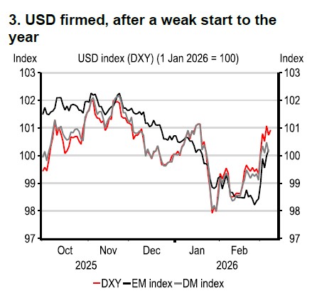 In Asia, mainland China’s Jan-Feb trade data surged and attention has been on the 15th Five-Year Plan, which targets a slightly lower range of 4.5-5.0% growth for 2026, supported by fiscal policy. Policy priorities include boosting domestic demand and stepping up the anti-involution campaign, while balancing trade.