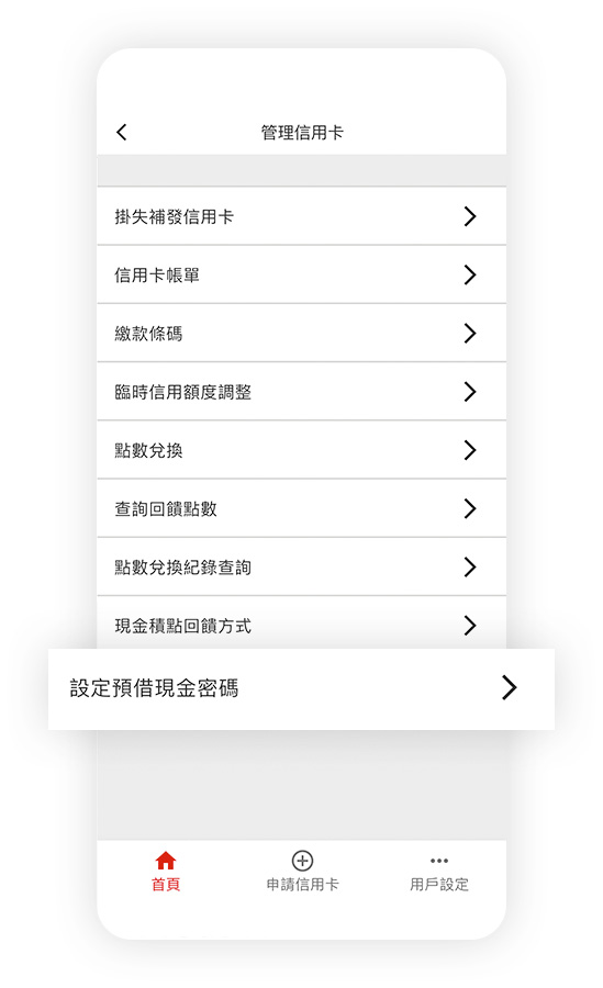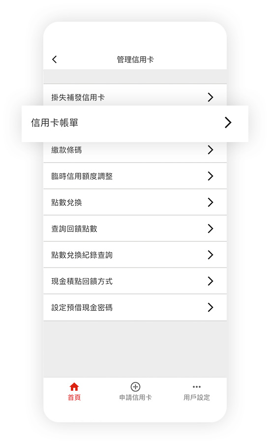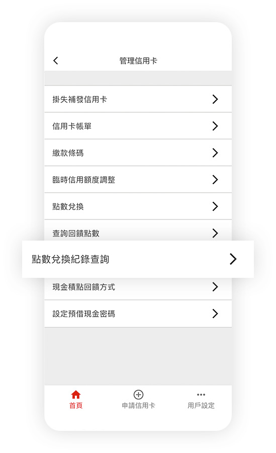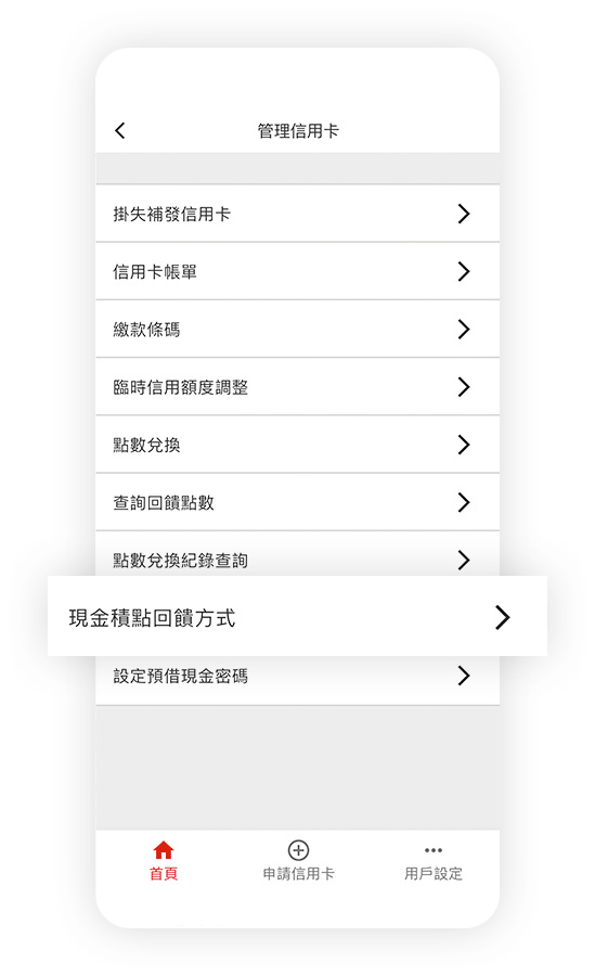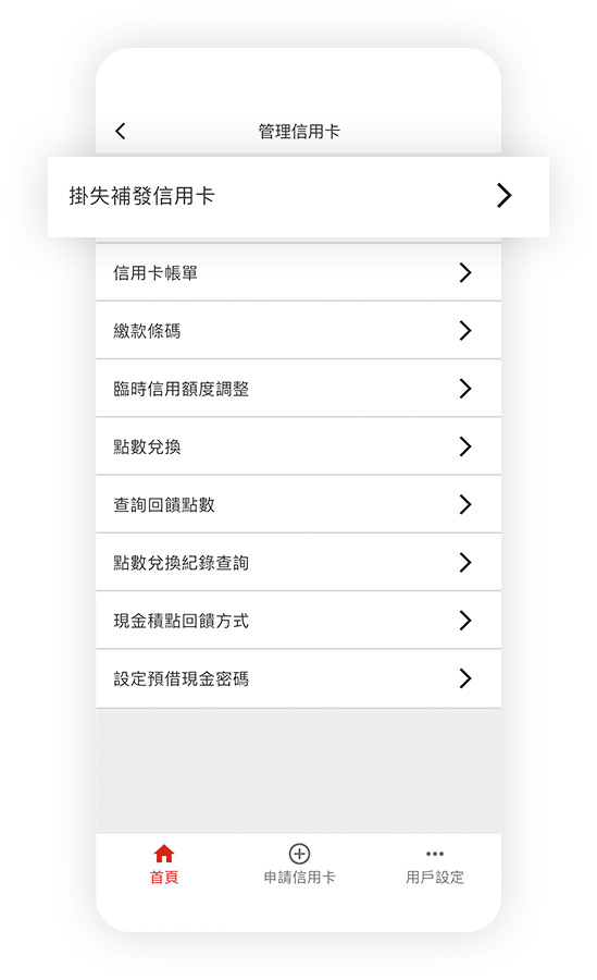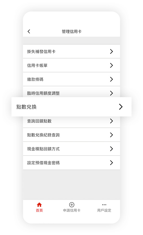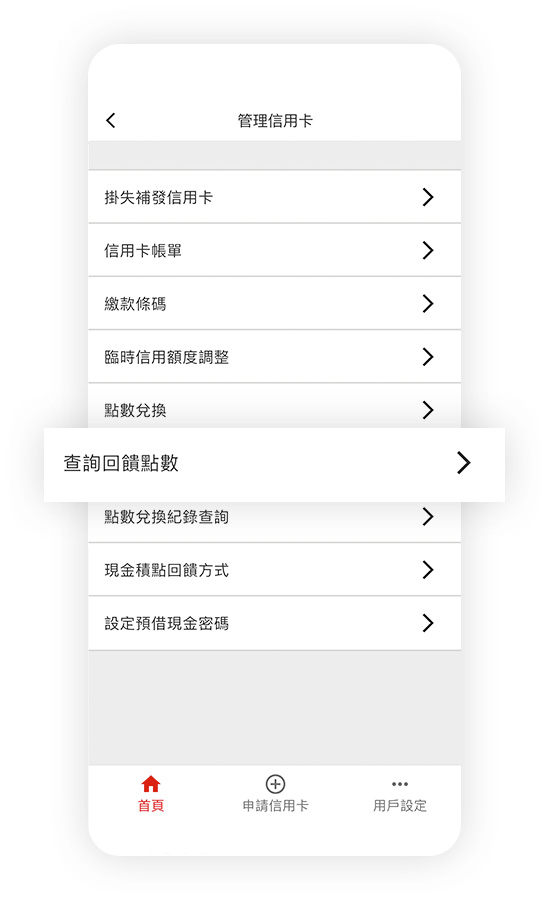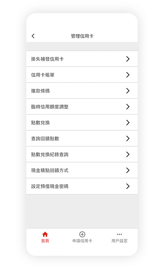 登入信用卡行動App服務後,您可於首頁點選卡片欄位進行卡片總覽、帳務資訊、交易明細、掛失補發信用卡、申請分期付款、臨時額度調整、現金積點回饋方式、點數兌換、查詢回饋點數、點數兌換紀錄查詢、設定預借現金密碼,隨時隨地掌握信用卡使用狀況,您也可以點選用戶設定以進行其它設定