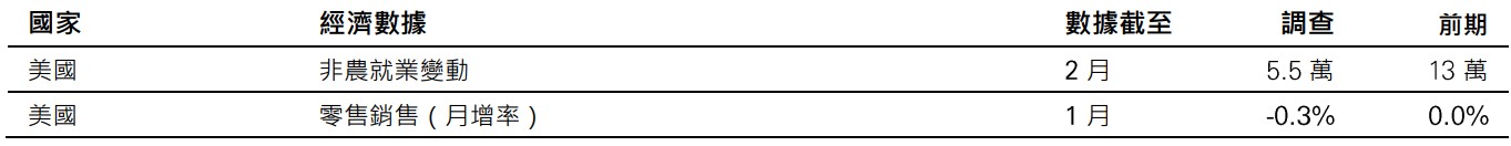 美國2月非農就業人數可能放緩,先前1月的漲幅較預期強勁。其他勞動市場指標表現不一。1月的惡劣天氣可能使零售銷售招受擠壓,但預期退稅可在未來數月提振消費。
