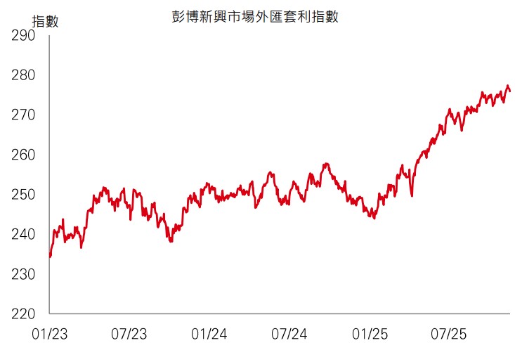 新興市場利差交易策略(即買入低收益貨幣、投資高收益貨幣)今年表現亮眼。彭博新興市場外匯套利指數(包括八隻新興市場高收益貨幣)年初至今兌美元升13%。當然,部分原因是美元在2025年上半年普遍弱勢。但值得留意的是,自7月以來,歐元等主要G10貨幣走勢停滯,英鎊和日圓等貨幣兌美元下跌,但新興市場主要貨幣繼續保持強勁升勢。