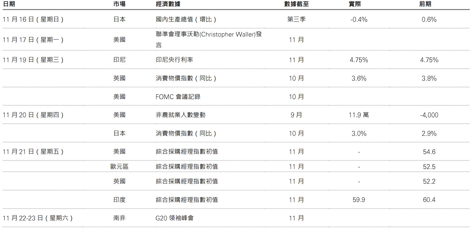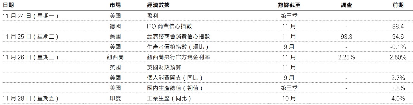 資料來源:滙豐投資管理。數據截至2025年11月21日(英國時間上午7時30分)。僅供參考,不應視為投資特定國家、產品、策略、行業或證券的建議。所表達的任何觀點均截至編製為止,如有更改,恕不另行通知。所提供的任何預測、預計或目標僅供參考,概非任何形式保證。*美國政府停擺終結,但預期官方數據公布仍會推遲