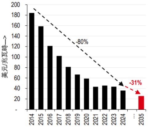 到 2035 年,全球太陽能平準化成本預計下降 31%