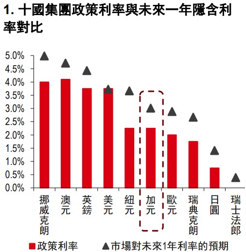 中東衝突期間,加元跑贏大多數十國集團貨幣。這種強勢表現已開始減弱,我們預計未來幾星期升勢將進一步放緩。雖然油價上升應該為加元提供一定支撐,特別是相對於進口能源的十國集團貨幣而言,但我們認為相對貨幣政策可能產生更大的影響(圖2)。