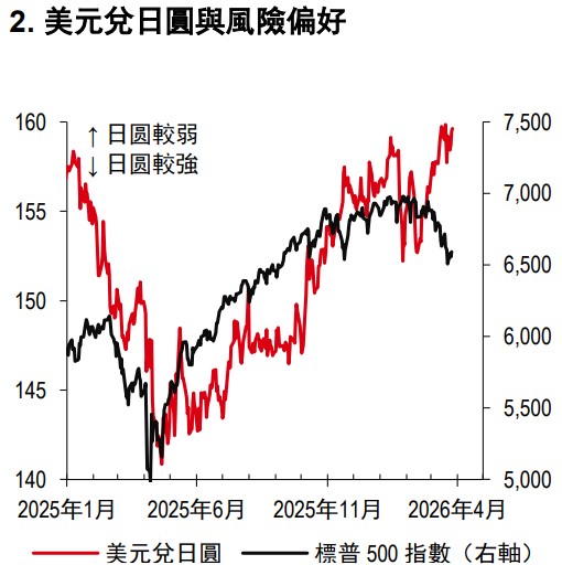 近期日圓走弱不難理解,這反映出能源價格上升為貿易條件帶來衝擊,以及日本龐大的石油和天然氣貿易淨逆差(2025 年約佔國內生產總值2.7%)。然而,更大的風險在於日圓的行為發生改變(圖2)。如果全球融資條件突然收緊,再加上股市波動加劇和美債收益率下降,就有可能出現這種情況。歷史經驗表明,在此類情形下,美元兌日圓在多數時候下跌(根據我們的分析,自2006 年以來,按星期觀測的數據顯示該匯率下跌佔比達85%)。