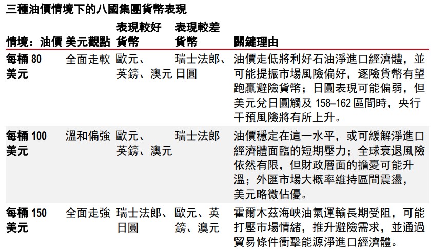 中東地緣政治仍是外匯市場的主要驅動因素。然而,相關消息面較難解讀,原因在於地緊張局勢可能會迅速升級或緩和。我們認為,市場走向可能取決於幾項實際指標,尤其霍爾木茲海峽航運受阻的程度,以及由此引發的油價走勢。隨著地緣政治風險跌宕起伏油價可能出現劇烈波動,推動市場情緒在「避險」與「逐險」之間反復切換。下表匯總三種油價情境下八國集團貨幣的潛在表現。