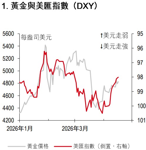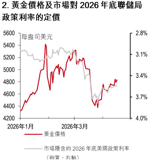今年以來,黃金價格波動劇烈。1月30日一度攀升至每盎司約5,450美元的歷史高位,隨後在3月23日跌至每盎司約4,405美元的年內低點,之後回升至每盎司4,800美元左右。本輪金價回調主要是美元走強(圖1)、美債收益率上行、油價高企、股市走弱以及中東持續衝突引發的集中清算拋售所致。衝突升級後,市場已將美國聯邦儲備局(簡稱「聯儲局」或「美聯準」)2026年底前的減息預期至少下調25個基點(圖2),這也對黃金不利。