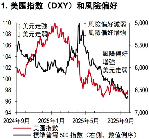 我們認為,未來幾星期美元似乎會上下兩難的局面。一方面,一些因素指向美元進一步下跌,例如風險偏好依然較強(圖1)以及美國政府面對的法律訴訟(路透社,2025 年9 月23 日)導致市場仍對美國聯邦儲備局(簡稱「聯儲局」或「美聯準」)的獨立性感到擔憂等。另一方面,考慮到聯儲局近期的言論似乎並不支持市場已計入的鴿派預期,週期性因素可能推動美元上升。