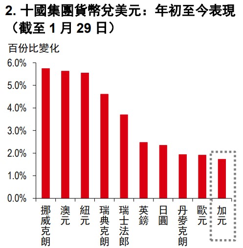 年初至今,美元在十國集團貨幣中表現墊底,加元緊隨其後(彭博資訊,1月29日)。儘管加元兌美元有所走強 —— 反映了美匯指數(DXY)整體走勢以及淨短倉倉位的減少(圖1)—— 但在十國集團貨幣中仍表現落後(圖2)。這主要源於美加貿易關係的不確定性,特別是即將進行的《美墨加協定》審查。