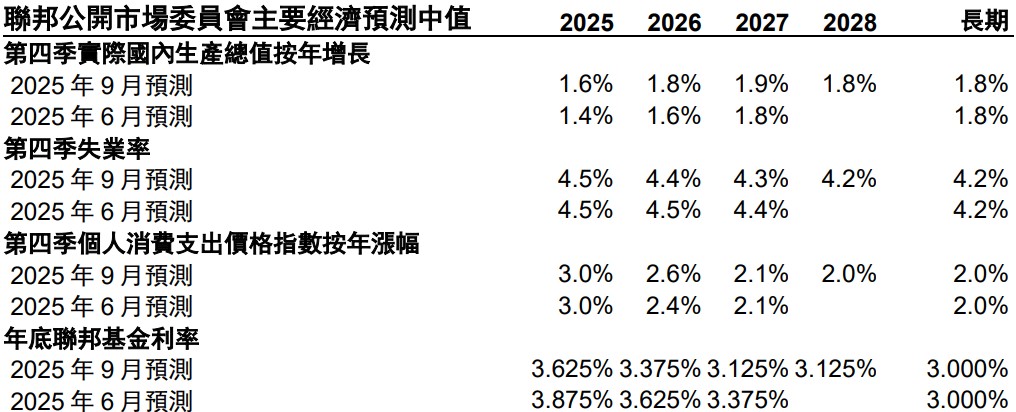 正如市場普遍預期,美國聯邦儲備局(簡稱「美聯準」或「聯儲局」)在9 月16 日至17 日會議上重啟減息週期,將聯邦基金利率目標區間下調25 個基點(即0.25%)至4.00%至4.25%,為今年首次減息。此次決定以11 票贊成、1 票反對獲得通過,唯一持反對意見的是聯儲局理事米拉(Stephen Mira),其支持減息50 個基點(即0.50%)。聯邦公開市場委員會(FOMC)的最新經濟預測調整幅度不大,但總體偏向鷹派,上調經濟增長和通脹預測,且下調失業率預測(詳見下表)。2025、2026 和2027 年的利率預測中位數(即「點陣圖」)比6 月點陣圖中的預測低了0.25%。最新點陣圖顯示,2025 年還有兩次減息,每次0.25%,2026 年則會再減息一次,這比市場預期的到2026 年底至少再減息四次,每次0.25%,更為鷹派(彭博資訊,2025 年9月18 日)。