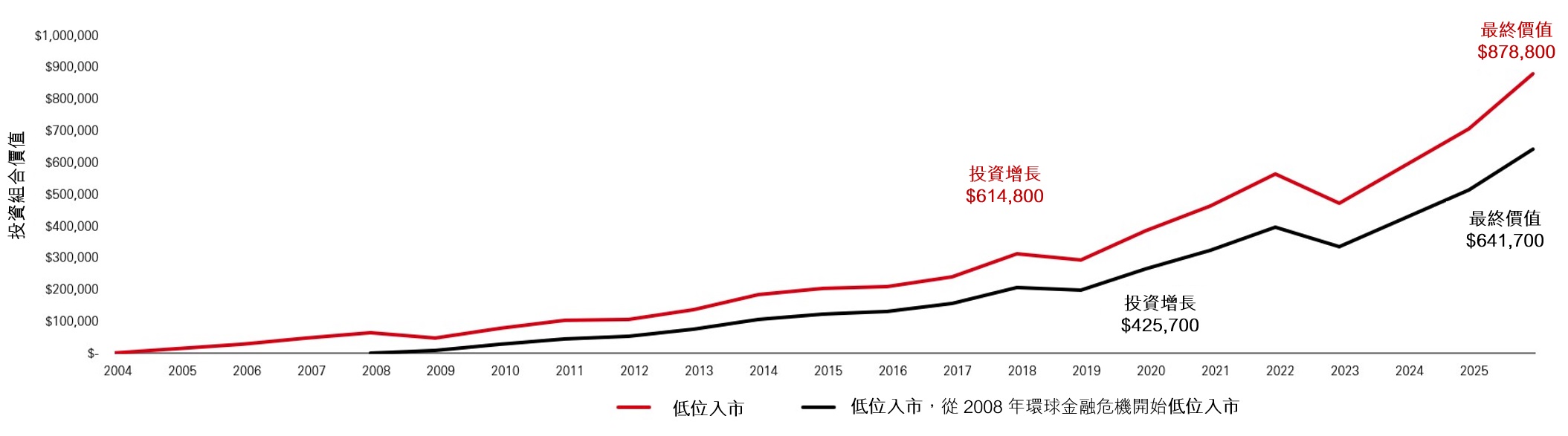 在圖表2中,黑線代表一位投資者等待市場大幅下跌才開始投資。儘管這位投資者的時機恰到好處,不僅每月在市場低位入市,更在市場崩盤期間,即股值處於特別低位的時候開始進場,但最終回報卻差得多。較早開始(紅線)意味著在此期間多投資 48,000 美元,利用複息的力量創造了額外 237,100美元價值。