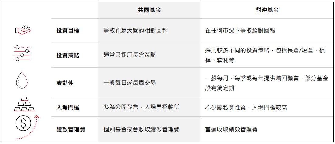 對沖基金採用非傳統的投資策略,包括長倉/短倉 (結合買入及賣出策略)、槓桿 (借貸投資)、套利(利用不同資產市場的價格差異)、交換(交換金融工具或現金流,例如固定及浮動利率) 等 ,以減低風險及提升潛在回報。這些策略與傳統資產的相關性較低,其多元化的優勢可減低投資組合的波幅,相對傳統資產或有助抗衡跌市的衝擊,並提供較佳的回報。