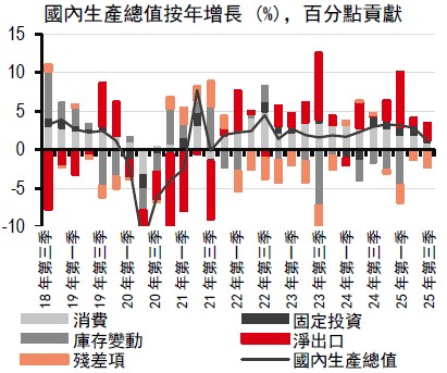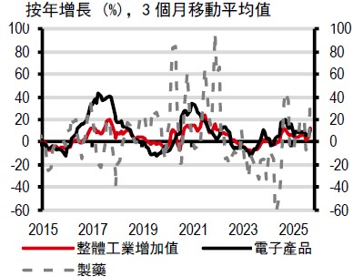 細分數據顯示增長預測上調主要源自製造業,其季調後按季增長超過11%。其中,電子行業顯著帶動了工業增加值的增長。這反映了科技驅動型經濟體的趨勢,即人工智慧驅動的需求以及貿易前置效應共同推動了經濟增長。