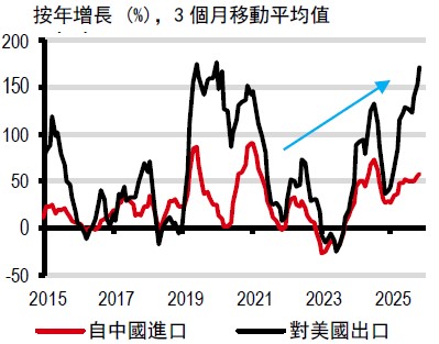 與其他依賴科技產業的經濟體類似,越南也受益於人工智慧驅動需求的激增。特別值得注意的是,僅對美國電子產品出口就按年大幅增長150%(以三個月移動平均值衡量),推動越南對美國出口總額按年增長30%。