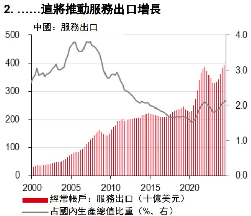中國出口的韌性超出預期。2025 年,受價格競爭力、強大性能和可靠性支撐,貨物貿易順差攀升至創紀錄的1.2 萬億美元。不過,中國製造企業正日益透過對外直接投資來優化供應鏈、應對貿易不確定性。這一趨勢仍處於早期階段。儘管對外直接投資可能在一定程度上替代貨物出口,但更有可能推動服務出口增長。
