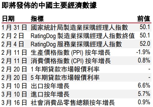 • 消費價格指數在12 月按年上漲0.8%,核心消費價格指數保持穩定(按年上漲1.2%),其中食品價格有所上漲(按年上漲1.1%),尤其是蔬菜價格(按年上漲18.2%)。在生產端,生產價格指數按年降幅收窄至1.9%,這得益於有色金屬製造業價格上漲(按年上漲10.8%),尤其是銅價在12 月創下歷史新高。