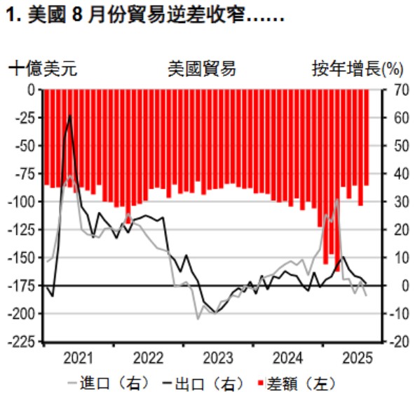 部分滯後的美國數據已發佈,其中8月貿易數據顯示美國貿易逆差有所收窄。這可能反映此前「搶跑式」進口趨勢消退後的部分回調。但關稅不確定性依然存在,因行業關稅可能調整,且《國際緊急經濟權力法》相關關稅仍待最高法院裁定。然而,隨著近期中美關係緩和,部分關稅也在下降,且在出現關稅推高消費價格的跡象後,多項農產品已被排除在加征範圍之外。