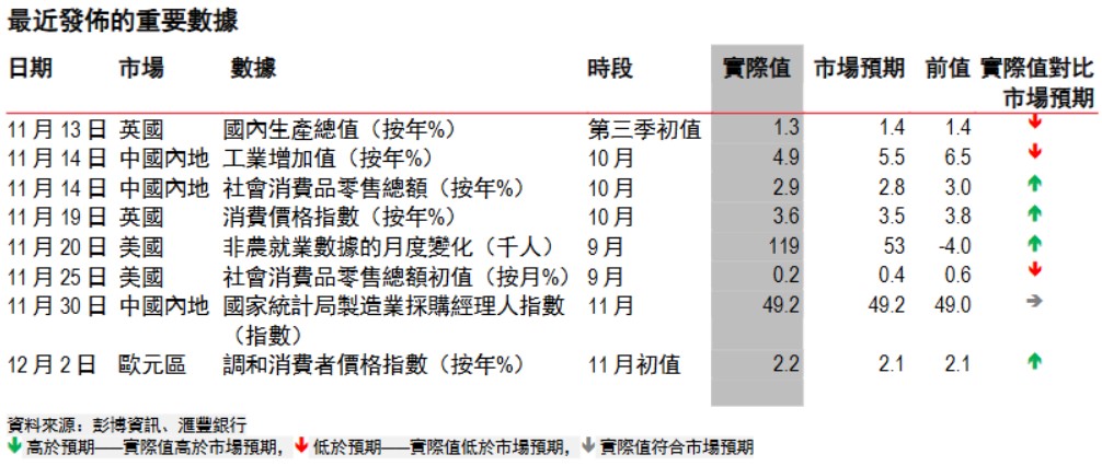 儘管印度第三季國內生產總值按年增長8.2%,但較低的通脹水平仍為進一步寬鬆提供空間。鑒於中國10月份的經濟數據表現令人失望,預計政府也將推出財政和貨幣刺激措施。投資、消費和工業增加值均出現放緩,反映外部和國內需求持續低迷。房地產行業亦再度走弱,一手住房銷售和房地產投資的降幅進一步擴大。