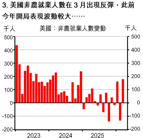 未來幾周,各國央行將密切關注數據,以判斷能源供給衝擊是否正向全球經濟的其他領域傳導。我們的基準情景是,大多數央行將暫時按兵不動;不過,儘管許多央行可能被迫收緊政策,但如果美國失業率顯著上升,則可能成為降息的觸發因素。美國3月勞動力市場數據顯示非農就業人數大幅上升,失業率小幅下降,但勞動力市場前景仍面臨諸多風險。
