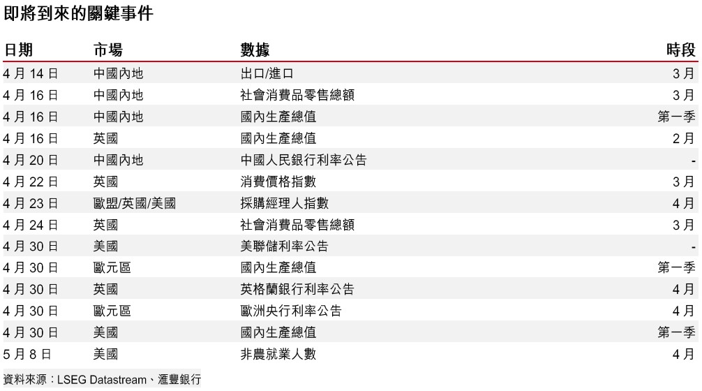 本報告由滙豐(台灣)商業銀行有限公司及HBAP(合稱「發行方」)向其客戶分發。本報告僅供一般傳閱和資訊參考目的。本報告在編製時並未考慮任何特定客戶或用途,亦未考慮任何特定客戶的任何投資目標、財務狀況或個人情況或需求。HBAP 根據在編製時來自其認為可靠來源的公開信息編製本報告,但未獨立驗證此類資訊。本報告的內容如有變更恕不另行通知。對於因您使用或依賴本報告,而可能導致您產生、或承受因此造成、導致或與其相關的任何損失、損害或任何形式的其他後果,HBAP 及發行方不承擔任何責任。對於本報告的準確性、及時性或完整性,HBAP及發行方並不作任何擔保、聲明或保證。本報告並非投資建議或意見,亦不以銷售投資或服務或邀約購買或認購這些投資或服務為目的。您不應使用或依賴本報告作出任何投資決定。HBAP及發行方對於您的此類使用或依賴不承擔任何責任。若對本報告內容有任何問題,您應該諮詢您所地區的專業顧問。您不應為任何目的向任何個人或實體複製或進一步分發本報告部分或全部的內容。本報告不得在任何禁止分派本報告的地區分發。